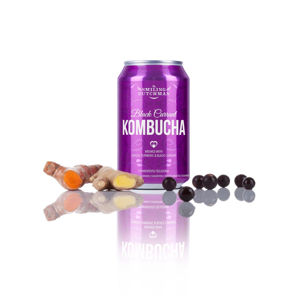 Mustaherukalla, inkiväärillä ja kurkumalla maustettu violetin värinen ja raikas kombucha. Mustaherukassa on paljon mm. antioksidantteja